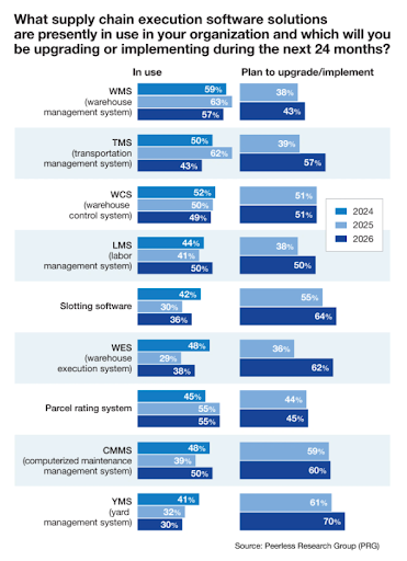 Warehouse management systems lead the software category, with 57% of respondents currently using a WMS and 43% planning to upgrade or implement one in the next 24 months. That level of sustained investment in WMS reflects something important: as operations become more automated and more complex, the need for a sophisticated, real-time management layer grows proportionally. A WMS is not just an order management tool, it is the central orchestration engine that connects labor, inventory, equipment, and fulfillment logic into a coherent operation. As robotics-picking, GTP systems, and AS/RS deployments expand, the WMS becomes the system that makes those investments work together.